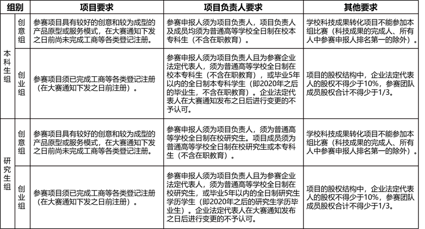 (2)根据参赛申报人所处学习阶段,项目分为本科生组、研究生组。根据项目发展阶段,本科生组和研究生组均内设创意组、创业组,并按照新工科、新医科、新农科、新文科、人工智能+、低空经济、生物技术、量子科技、新能源、新材料设置参赛项目类型。