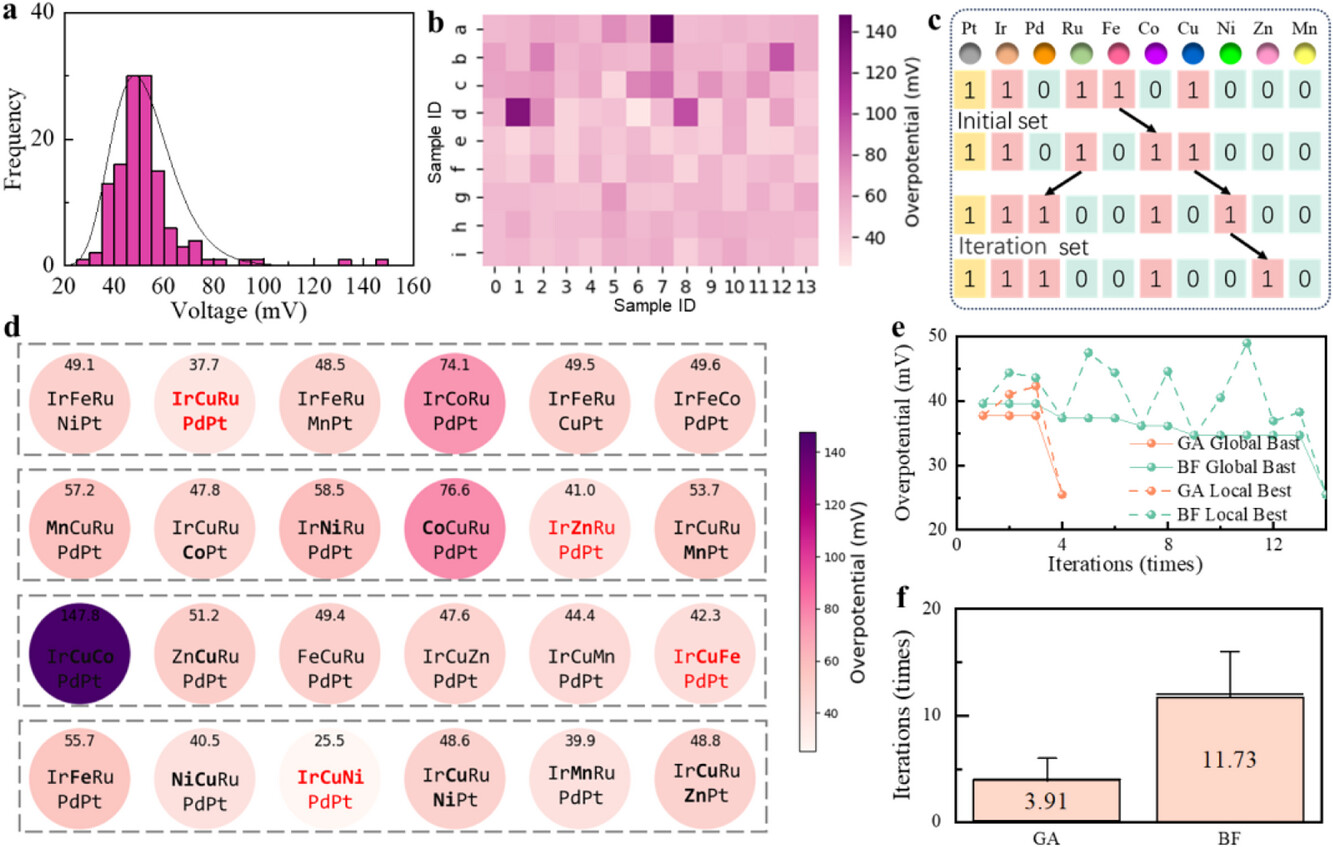 基于GA的迭代优化流程(图4c)从126种候选组合中筛选出最优催化剂。初始六组随机组合的过电位分布广泛(20-160 mV)(图4a),热图分析(图4b)进一步揭示元素组合对活性的显著影响。通过四轮迭代(图4d),保留高活性元素并替换低效组分,最终获得IrCuNiPdPt/C催化剂,其过电位(25.5 mV@10 mA/cm²)较初始组合降低80%(图4e)。20次独立优化试验验证了方法的鲁棒性(图4f),实验迭代次数减少60%,且结果高度一致。