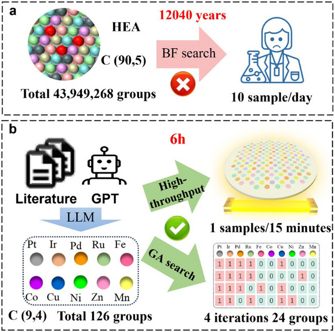 本研究通过整合大型语言模型(LLMs)与遗传算法(GA),构建了高熵合金(HEA)催化剂的高效筛选框架(图1)。传统暴力搜索法(BF)需从90种金属元素中筛选五元组合,候选池达4395万种,以每日10个样本的速率需耗时约1.2万年(图1a)。而LLMs通过文献挖掘将候选元素压缩至10种(Fe、Co、Ni、Pt等),结合铂基设计生成126种候选组合(图1b);GA通过四轮迭代(24个样本)快速锁定最优组分,结合超快高温热冲击(HTS)技术(15分钟/样本),整体筛选周期缩短至6小时。这一策略通过智能数据降维与实验自动化,解决了HEA设计中的“组合爆炸”难题,为多组分催化剂的理性设计提供了新范式。