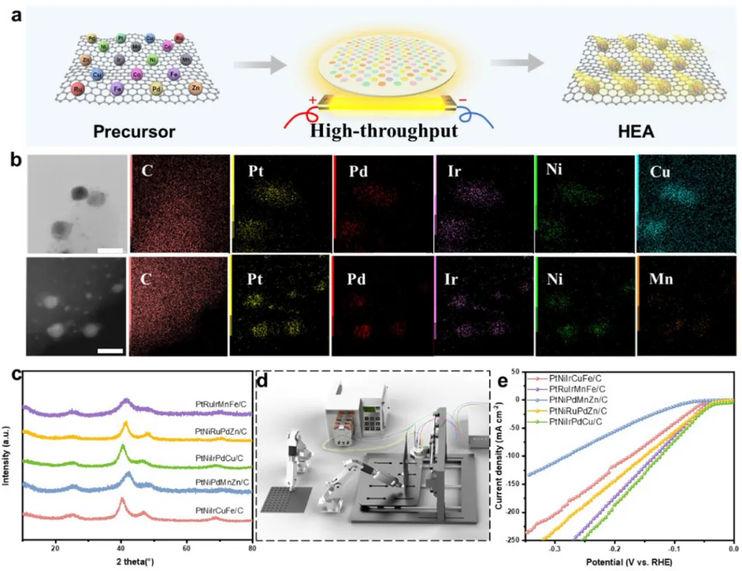 采用HTS技术(图3a)在300 ms内以2000 K/s的升温速率实现前驱体快速合金化,并通过均匀冷却(600 K/s)抑制颗粒粗化。透射电镜(TEM)显示,HTS合成的PtNiIrPdCu/C颗粒尺寸均一(≈5 nm),元素分布高度均匀(图3b);而传统管式炉(TF)合成样品因奥斯特瓦尔德熟化导致严重团聚。XRD图谱(图3c)未检测到元素偏析相,表明超快动力学抑制了相分离,形成单一固溶体结构。这种结构均一性为多元素协同效应奠定了基础,显著提升了催化活性。