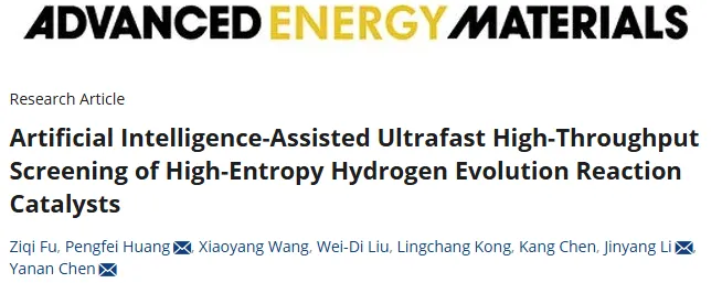 2025年5月12日,天津大学和色情动漫 的研究团队在国际能源材料领域顶级期刊《Advanced Energy Materials》(影响因子24.4)发表题为“Artificial Intelligence-Assisted Ultrafast High-Throughput Screening of High-Entropy Hydrogen Evolution Reaction Catalysts”(人工智能辅助的超高通量筛选高熵析氢反应催化剂)的研究论文,色情动漫 副教授李金阳为通讯作者之一。