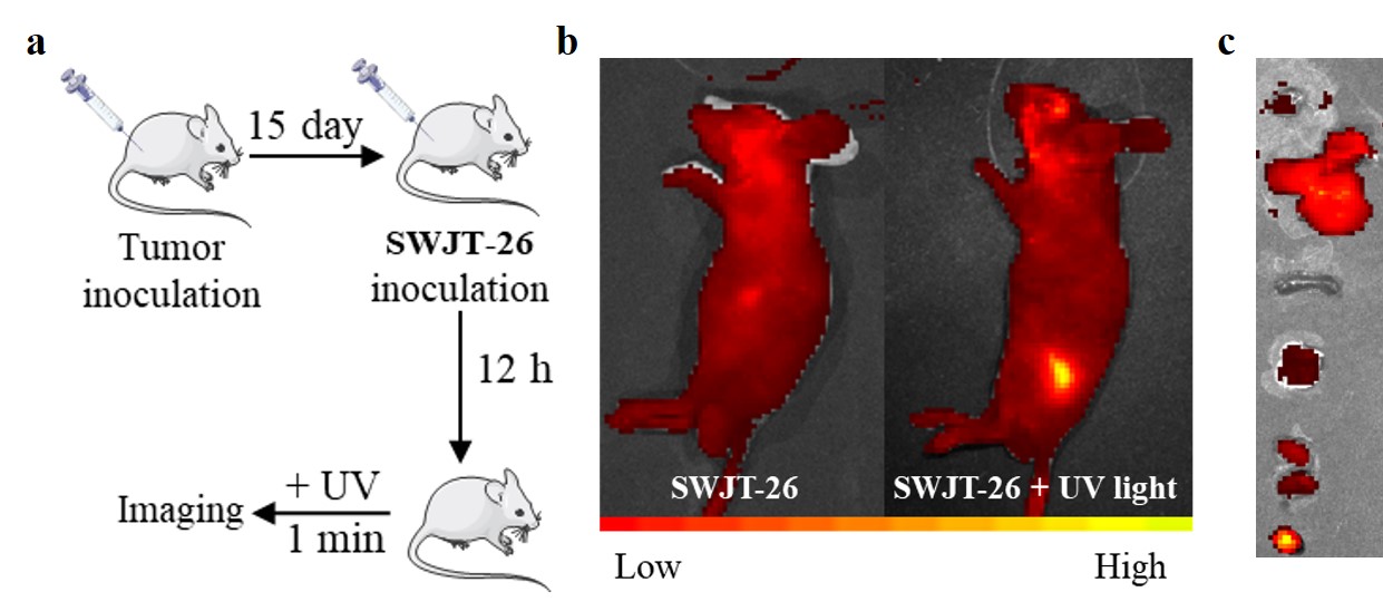 光激活荧光探针是一种强大的分子工具,广泛用于时间控制的细胞成像。然而这类探针的发展并不成熟,大多数激发波长较短、紫外线照射时间较长,导致细胞更易死亡。此外,较长的反应时间难以实现定时成像。因此,急需设计出一种高灵敏度快速响应的光激活探针用于生物组织的定时可控成像。