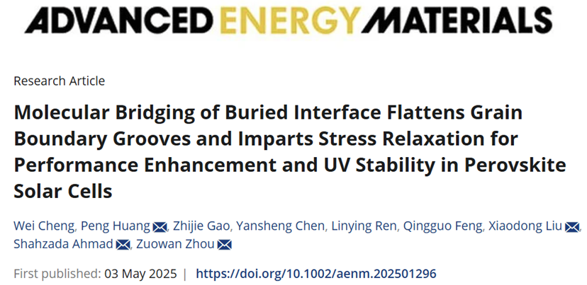 周祚万教授指导的博士研究生程伟同学在钙钛矿太阳能电池埋底界面调控方面的研究取得重要进展,相关研究成果以“Molecular Bridging of Buried Interface Flattens Grain Boundary Grooves and Imparts Stress Relaxation for Performance Enhancement and UV Stability in Perovskite Solar Cell”为题发表在最近出版的国际能源材料顶刊《Advanced Energy Materials》上。程伟为第一作者,色情动漫