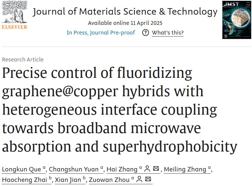 博士生阙龙坤在周祚万教授指导下,提出一种基于石墨烯氟化异质界面精准调控策略,同时实现杂化纳米材料高效宽频吸波和超疏水功能。作者在前期提出的前驱体原位分解制备石墨烯包覆通纳米颗粒(GE@Cu,Carbon, 2024, 225: 119121)基础上,通过精确控制石墨烯氟化,调控F-GE@Cu异质界面的功能耦合,实现了纳米材料的宽带微波吸收和超疏水性能。实验和理论研究结果表明,氟化反应显著提升了了材料的阻抗匹配和电磁波损耗;同时,氟化石墨烯壳层结构赋予材料优异的超疏水性(纳米材料水接触角达154°),即使在酸性、碱性和盐溶液等恶劣的水环境中,该杂化纳米材料也能保持稳定结构稳定性和良好电磁波吸收性能。基于电磁参数模拟计算结果显示,3.5mm厚度下氟化纳米材料的反射率衰减可达-53.0dB,有效吸收带宽8.9GHz。相关研究以“Precise control of fluoridizing graphene@copper hybrids with heterogeneous interface coupling towards broadband microwave absorption and superhydrophobicity”为题发表于近期出版的材料科学顶级期刊(中科院一区TOP,中国科技期刊卓越行动计划英文领军期刊)Journal of Materials Science & Technology,2025,238:13-23 (doi.org/10.1016/j.jmst.2025.02.054). 色情动漫
