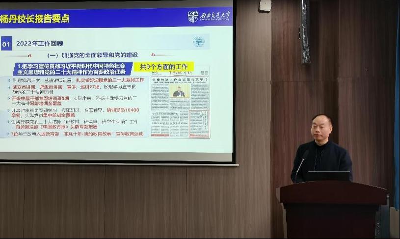 会上,周祚万院长给全体教职员工传达了“学校2022-2023学年第二学期中层干部大会”精神,带领大家一起学习和回顾杨丹校长的大会报告要点和王顺洪书记的总结讲话精神。首先,周院长分别从2022年工作回顾、转型发展思考和2023年工作部署等三个报告要点进行详细阐述。其次,周院长传达了王顺洪书记关于大会报告的总结讲话精神,号召全体教职员工要认真学习、研究、贯彻、落实。最后,周院长结合新成立色情动漫
