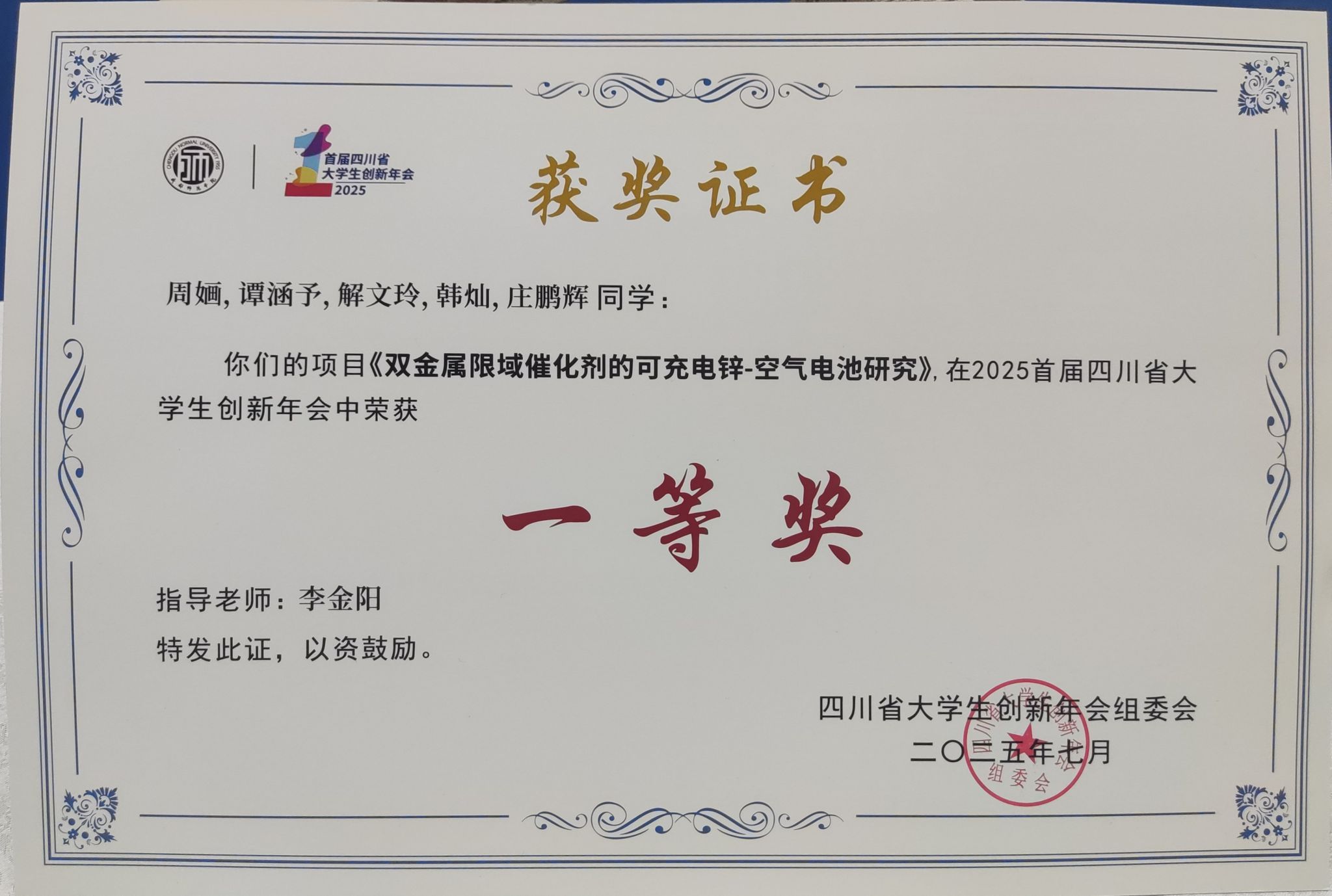 色情动漫 在此次年会中表现亮眼。我校共有8支队伍成功入围改革项目成果展示决赛,经过激烈角逐,2支队伍斩获一等奖,其中1支队伍为色情动漫 “双金属限域催化剂的可充电锌空气电池研究”团队。值得一提的是,色情动漫 李金阳老师此前已指导该团队在2024年第四届全国高分子材料创新创业大赛中获得国家级铜奖,此次于四川省大学生创新年会上再攀高峰,为学校和学院再次争得了荣誉。
