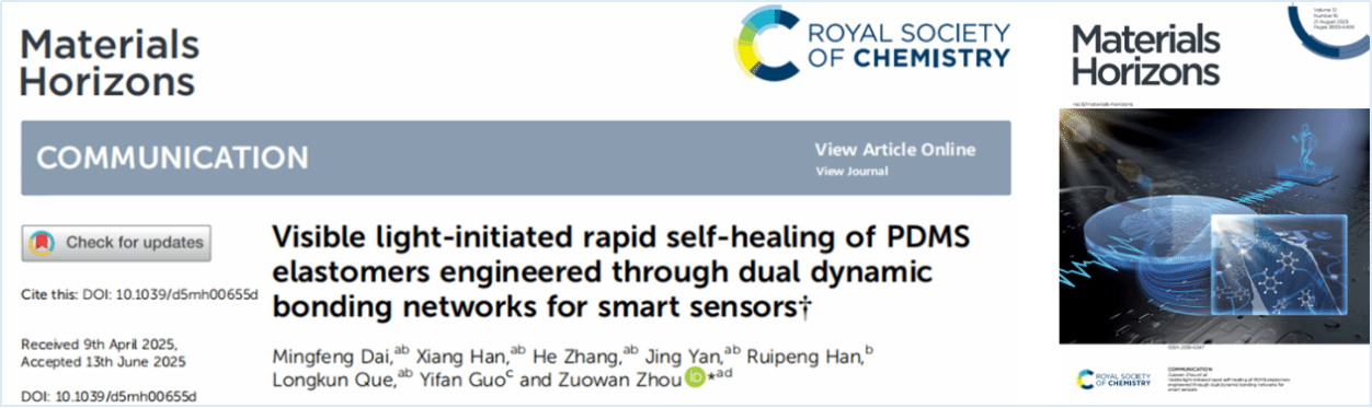 上述研究成果以“Visible light-initiated rapid self-healing of PDMS elastomers engineered through dual dynamic bonding networks for smart sensors”为题发表于材料领域知名期刊《Materials Horizons》,并以Inside Front Cover形式予以报道。论文第一作者为色情动漫 博士生代明凤,导师周祚万教授为通讯作者。