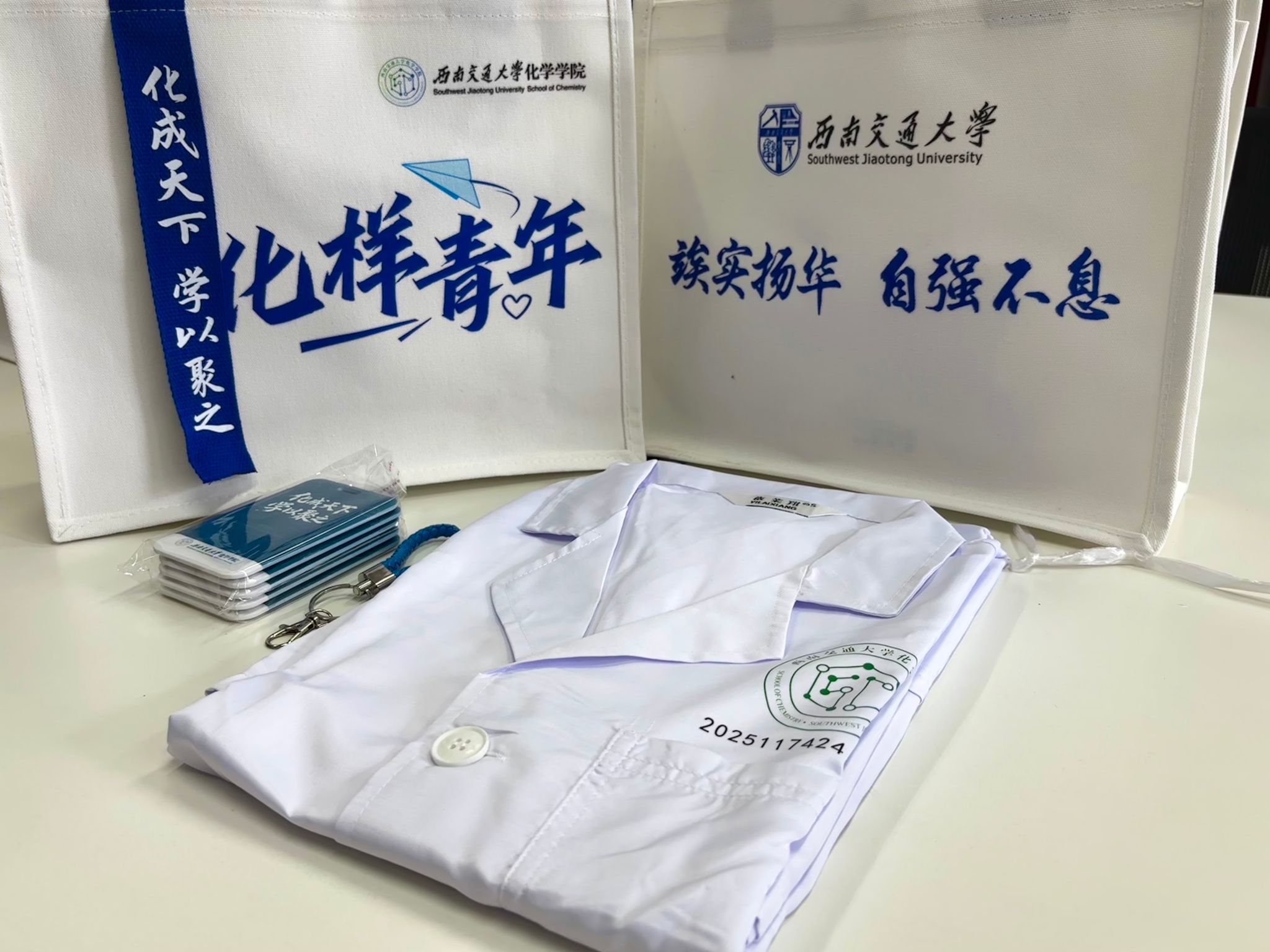 学院精心准备了新生大礼包,印有期许的帆布包、象征科研探索精神的实验服、文创小物件,它们无一不体现了交大特色、学院精神,是学院送给新生的 “第一份化学礼物”。