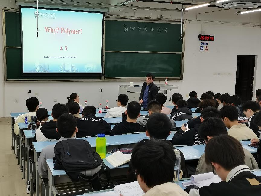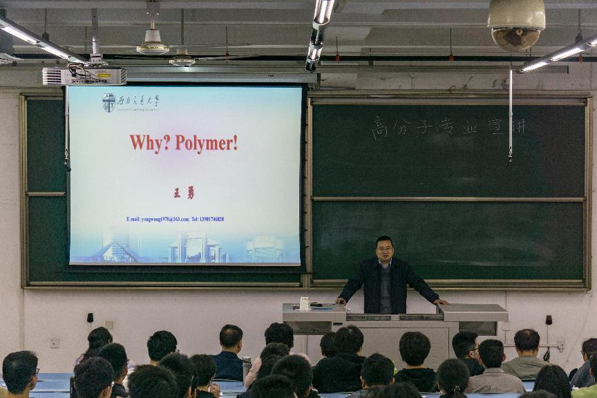 王勇老师带来了题为“Why,polymer?”的演讲,以日常生活中随处可见的高分子制品为切入点,向各位同学全面介绍了高分子材料,指出高分子材料与人们的生活息息相关,也是国民经济发展的支柱产业。王勇老师介绍了我校高分子专业的发展历史、学科方向、研究领域以及专业建设等,并从毕业生的就业、升学、留学、创业等方面介绍了就读高分子专业的美好前景,对有志于选择高分子材料与工程专业的同学表示热烈的欢迎。