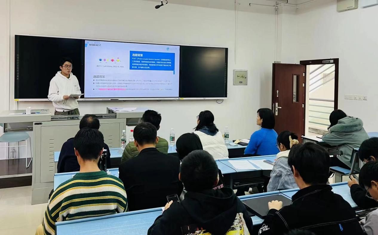 本次答辩由杨静晖老师主持,杨静晖、徐晓玲、姜曼、李金阳、孙得翔、祁晓东老师(排名不分先后)担任评委。参加本次中期答辩的项目共7项;其中,国家级1项、省级3项、校级3项。答辩项目包括《双金属限域催化剂的可充电锌-空气电池研究》、《3D打印制备仿树木天然高分子复合净水材料》、《氮掺杂片层花状氧化锌的制备及其光响应抗菌性能的研究》、《碳纤维@聚磷腈杂化填料的制备及其对环氧树脂阻燃性能和力学性能的影响机制研究》、《具有高粘附性、热能存储及光热转换的相变凝胶传感器》以及《具有可拉伸性、自粘附性和导电稳定性的PDMS基电子皮肤》。