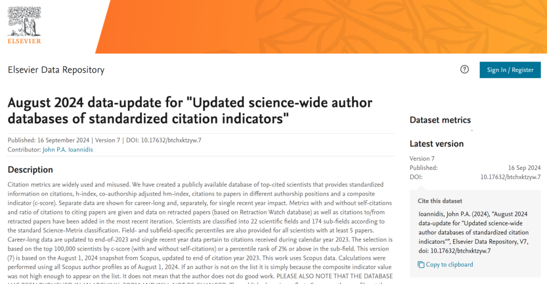 近日,美国斯坦福大学(Stanford University)相关研究团队发布了2024年第七版全球前2%顶尖科学家榜单(World’s Top 2% Scientists)。榜单分为“终身科学影响力榜单”(关注整个学术生涯迄今的影响力)和“年度科学影响力榜单”(聚焦本年度学术成就)。