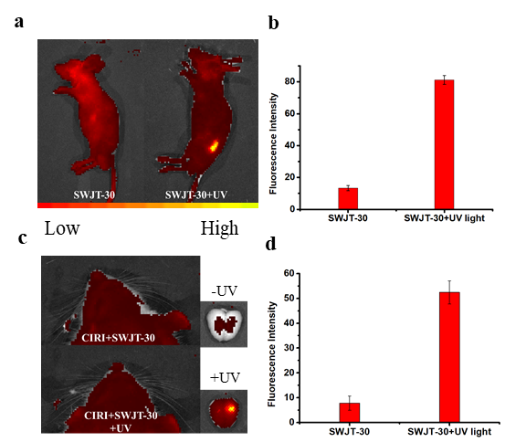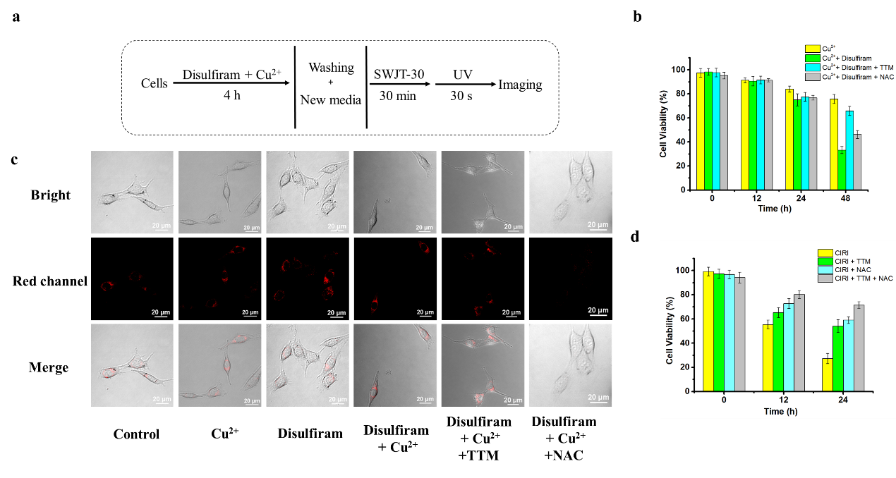 在这项工作中,作者开发了一种基于磺酸酯识别基团的新型光辅助激活荧光探针。该探针仅在紫外线(UV)和超氧阴离子(O2•‒)同时存在时才会产生荧光信号。这种双重识别机制确保了荧光信号的精确可控性,同时保持了高特异性和最快的反应动力学(<30 s)。基于这一设计,构建了一种线粒体靶向和血脑屏障穿透探针(SWJT-30),用于时间可控地检测脑缺血再灌注损伤(CIRI)中的活性氧波动。通过这项研究,作者不仅阐明了铜死亡在CIRI中的作用,还证明了光辅助激活探针在不同病理和生理背景下进行时空控制成像的广泛潜力。