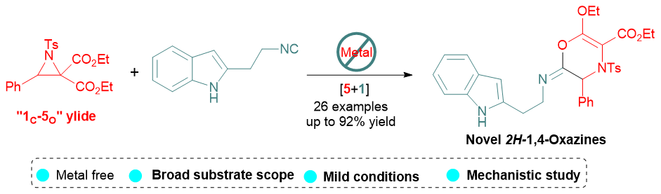 另一方面,donor-acceptor吖啶参与的环加成反应具有原子经济性、环境友好、反应条件温和等优点。目前报道的donor-acceptor吖啶参与的环加成反应以[3+1]/[3+2]/[3+3]反应构建氮杂四/五/六元环为主,donor-acceptor双酯基吖啶作为“1C-5O”偶极子参与的[5+n]的环加成反应还没有报道。基于此,本课题组在前期工作基础上(Chem. Commun.2021,57, 11092–11095,Org. Lett.,2023,25, 3829–3834),首次发展了无金属参与的donor-acceptor吖啶与吲哚异腈的[5+1]环加成反应合成含有吲哚骨架的官能化的2H-1,4-噁嗪化合物。