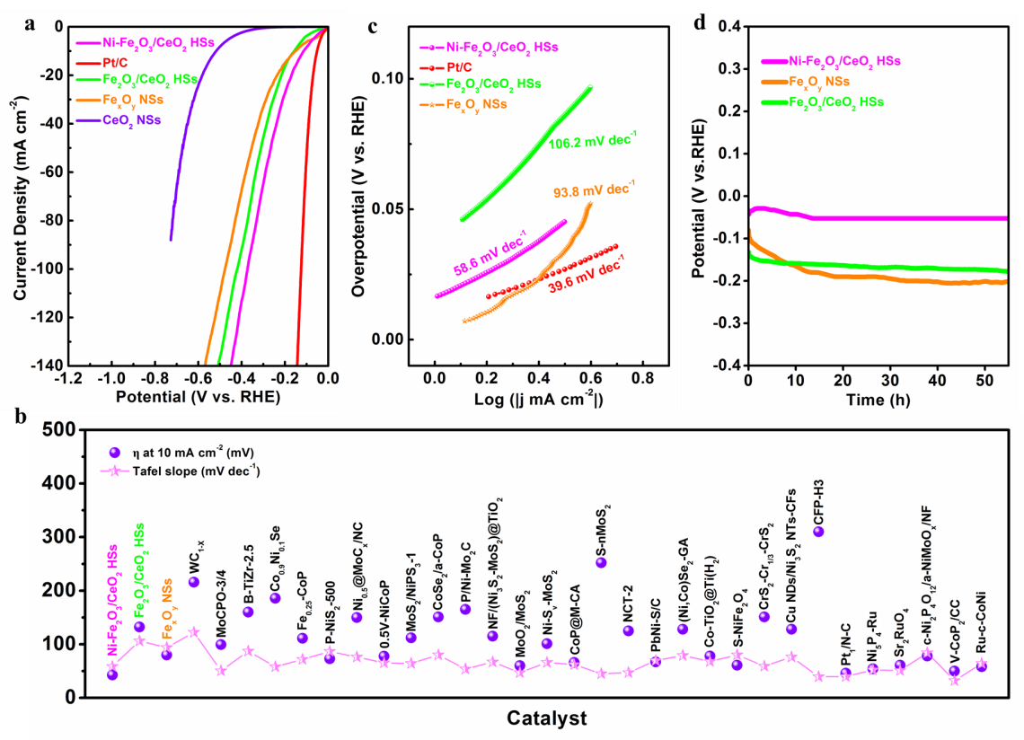 图2a为样品在25 ℃下,1 M KOH电解液中的HER性能。其HER活性的递减顺序为:Pt/C>Ni-Fe2O3/CeO2HSs> FexOyNSs > Fe2O3/CeO2HSs> CeO2NSs。在阴极电流密度恒定为10 mA cm-2的情况下,采用计时电位法对Ni- Fe2O3/CeO2HSs,Fe2O3/CeO2HSs和FexOyNSs进行了长达55小时的稳定性测试。如图2d所示,Ni- Fe2O3/CeO2HSs具有显著的稳定性。
