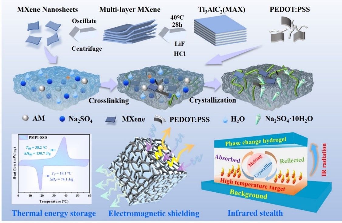 随着电子信息技术的快速发展,电磁干扰和红外隐身技术在在国防工业领域变得越来越重要。其中,电磁干扰不仅会导致电子设备发生故障,还会威胁人体健康。同时,红外探测器可监视和跟踪高于环境温度的设备和人体。因此,开发一种兼具电磁屏蔽和红外隐身的多功能材料,对于保障人体安全和维持电子设备的平稳运行具有重要研究意义。