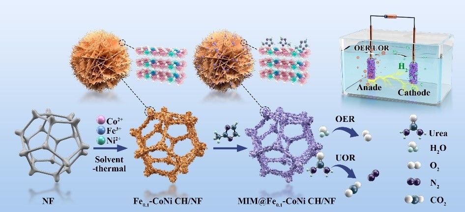 本工作以铁钴镍三金属碱式碳酸盐为牺牲模板原位生长ZIF-67得到具有三维分层纳米阵列结构的MIM@Fe0.1-CoNi CH/NF。MIM@Fe0.1-CoNi CH/NF作为电解水的阳极材料表现出优异的OER/UOR双功能电催化性能。MIM@Fe0.1-CoNi CH/NF在1.0 M KOH的电解液中仅需194 mV和285 mV过电位即可达到10和100 mA·cm-2的电流密度,而在1.0 M KOH + 0.5 M尿素电解液中仅需1.31 V (vs.RHE)即可达到10 mA·cm-2的电流密度。值得注意的是,(+)MIM@Fe0.1-CoNi CH/NF||Pt/C/NF(-)在尿素辅助电解水条件下达到10 mA·cm-2仅需1.36 V (vs.RHE)。本文通过反应前后XPS、DFT计算、in-situ Raman 等手段证明,Fe3+和2-MIM的引入改变了Ni2+和Co2+的电子结构,优化了OER/UOR中间体的吸附行为。总的来说,这项工作为在前驱体模板材料上可控调整MOF材料的界面组装提供了策略,同时为制备清洁能源和废水处理所需催化剂提供了参考。