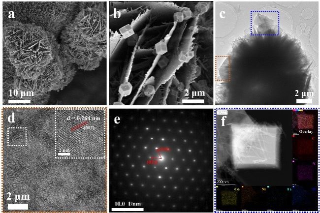 图2.MIM@Fe0.1-CoNi CH/NF的(a,b)SEM,(c)TEM,(d)HRTEM,(e)SAED,(f)EDX图。