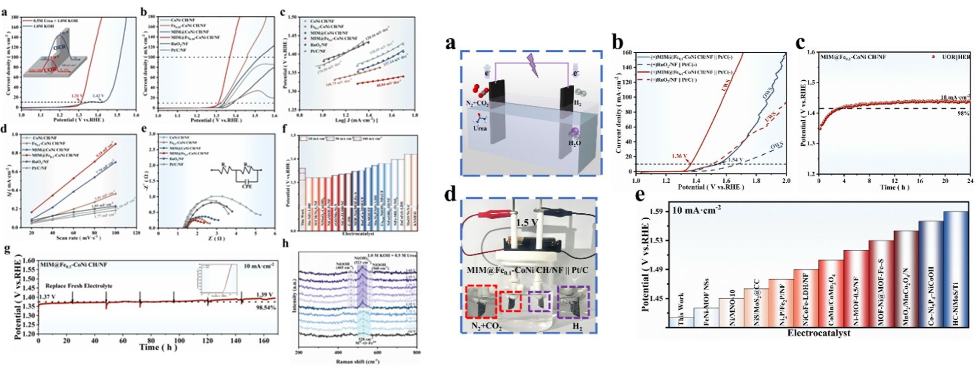 图4. 左图系列材料的UOR性能测试;右图MIM@Fe0.1-CoNi CH/NF的电解水性能测试。