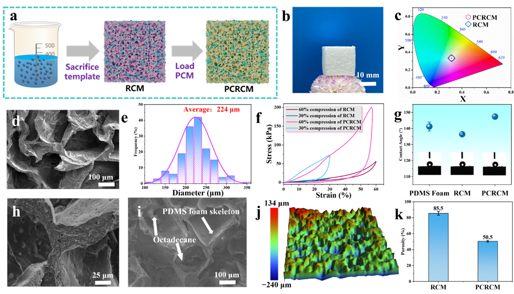 图1. PCRCM的制备及结构表征。(a) PCRCM制备过程示意图。(b) PCRCM的摄影图像。(c) PCRCM和RCM的色度图。(d)和(h) RCM的SEM图像。(e) RCM的孔径分布图。(f) RCM的应力-应变曲线。(g)泡沫的疏水性。(i) PCRCM的SEM图像。(j)白光干涉扫描显示PCRCM的表面粗糙度。(k) RCM和PCRCM的孔隙率。