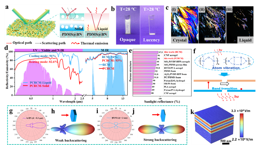 图3. RCM和PCRCM的光学特性。(a) PCRCM动态反射太阳光的机制。(b, c) 不同温度下ODE透射率的变化。(d) 泡沫的特征发射率/反射率曲线。(e) 与其他文献的光反射率比较。(f) 位于大气窗口的化学键。(g-j) 不同形状粒子在500 nm光照射下的偏振和三维远场图。(k) 500 nm光照射下PDMS@BN界面处电场分布。