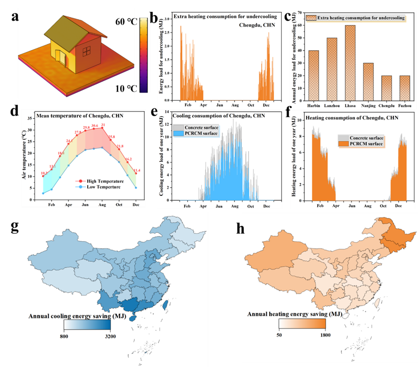 图5. 潜在的建筑节能。(a) 房屋在太阳照射下的温度分布。(b) 成都年度气候条件下RCM的过冷所需的额外供暖消耗。(c) 在中国六个不同城市的年度气候条件下,由于RCM过冷所需要的额外供暖消耗。(d) 中国成都的月气温分布。(e) PCRCM作为墙面时的冷却能量负荷,并与混凝土表面进行比较。(f) 使用PCRCM作为壁面时热能负荷。(g) PCRCM在中国不同地区的年度制冷节能。(h) PCRCM每年在中国各地区的供暖节能情况。