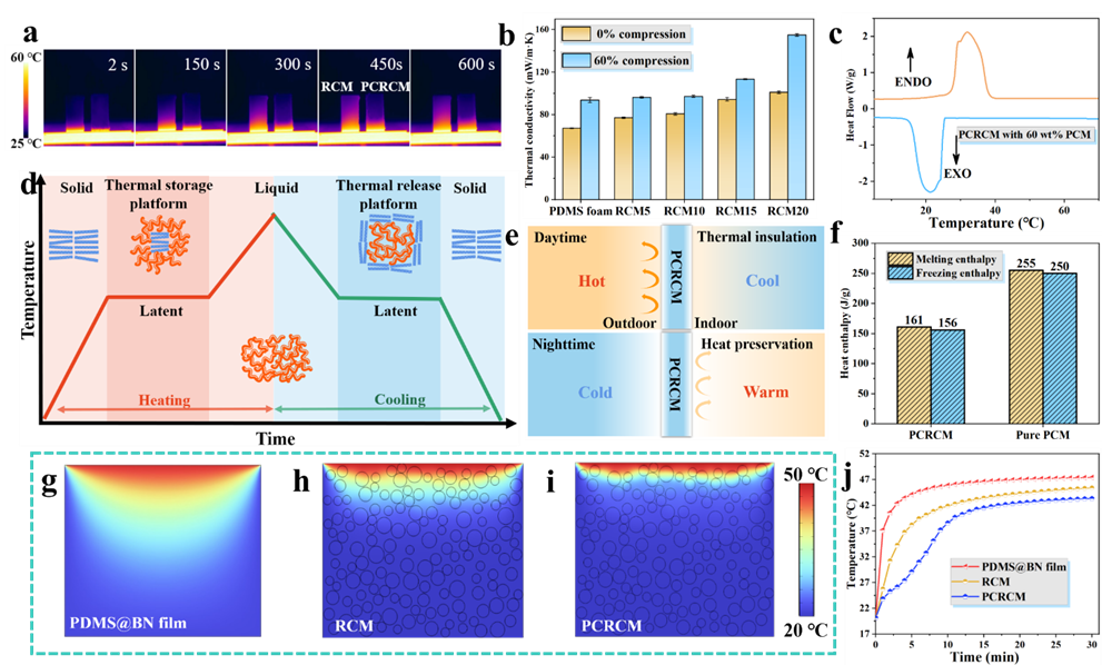 图2. 储热和隔热性能。(a) PCRCM和RCM的保温性能比较。(b)含不同BN质量分数的RCM样品的导热系数。(c) PCRCM的DSC曲线。(d) PCRCM中的相变示意图。(e) PCRCM在建筑物内的工作原理示意图。(f) PCRCM和纯ODE的熔化/结晶焓。(g-i) RCM、PCRCM和PDMS@BN保温性能的模拟。(j) RCM、PCRCM和PDMS@BN膜的温度-时间曲线。