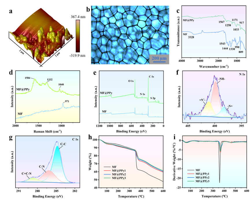 图2 MF@PPy泡沫的结构表征。a MF@PPy泡沫的AFM图像。b MF@PPy泡沫的光学显微镜图像。c MF和MF@PPy泡沫的FTIR光谱。d MF和MF@PPy泡沫的拉曼光谱。e MF和MF@PPy泡沫的XPS光谱。MF和MF@PPy泡沫的f N 1s和g C 1s XPS光谱。MF和MF@PPy泡沫的h TGA和i DTG曲线。