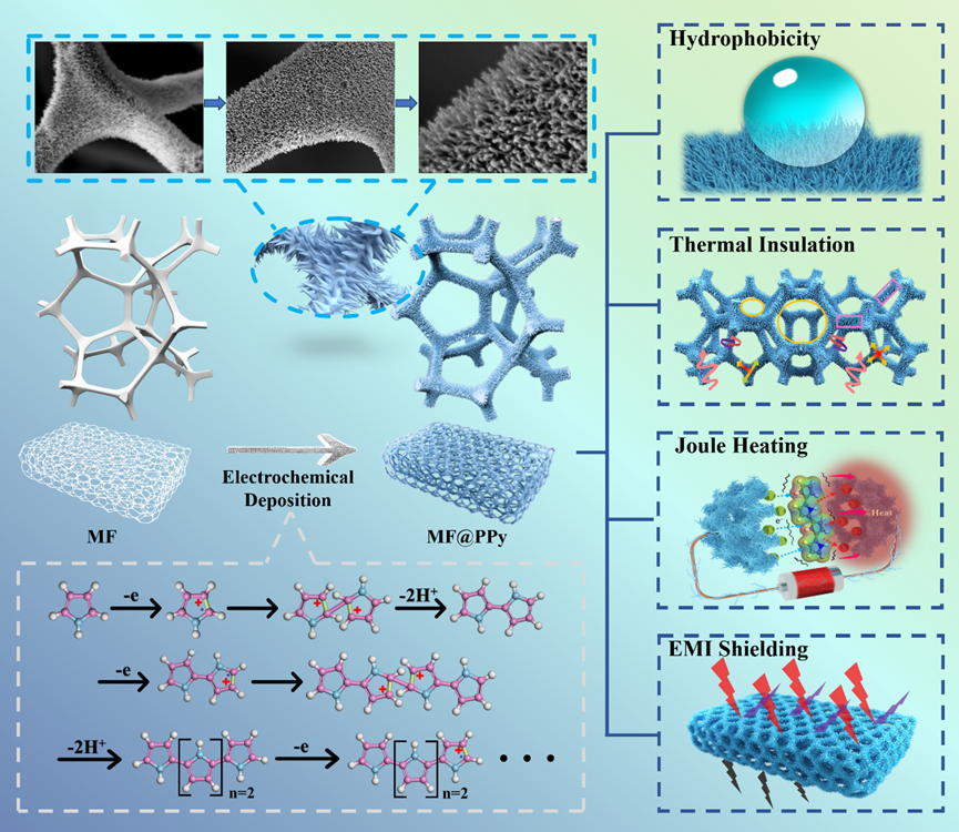 图1 MF@PPy泡沫的聚合机理和多种功能示意图。MF@PPy泡沫实现了多功能集成,包括疏水性、隔热性、动态红外热伪装性和电磁干扰屏蔽性。