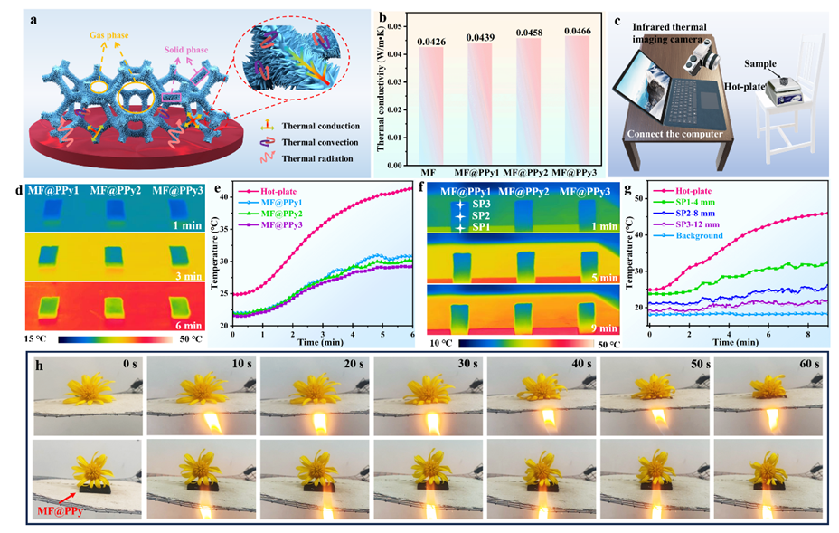 图4 MF@PPy泡沫的隔热性能。a MF@PPy泡沫的隔热机理示意图。b MF@PPy1、MF@PPy2和MF@PPy3的导热系数。c红外隐身性能测试示意图。d, e MF@PPy泡沫平行放置和f, g MF@PPy泡沫直立在热台上的红外热图像和温度曲线。h花朵在石棉网和MF@PPy泡沫下被火加热朵照片。