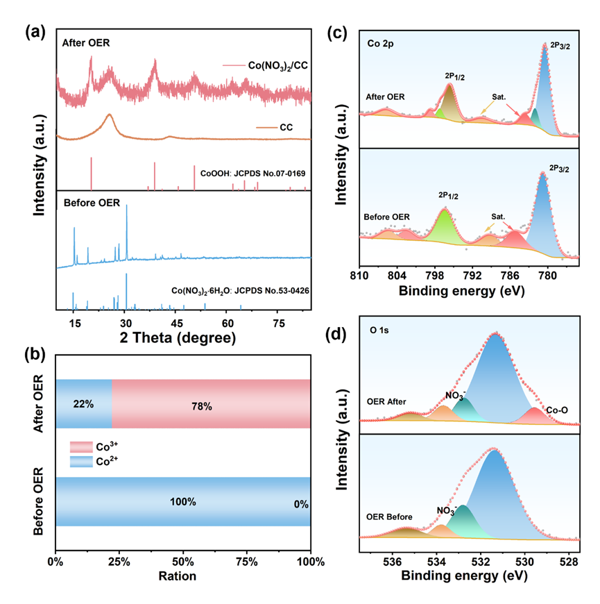 在这项工作中,作者利用一步电化学重构的方法得到催化剂CoOOH-NO3-,这是因为在电化学过程伴随着原料中的阴离子吸附在CoOOH上,进而通过吸附的阴离子调控界面微环境来促进OER。究其原因,是因为吸附阴离子后可改善CoOOH内紧密层OH-过渡吸附问题,使活性位点更易枝接OH-,从而调节界面微环境。通过一系列实验验证了界面微环境得到调控,如电极表面接触角变小易于O2释放解析,促进Co向高价态转变和降低反应发生起始电位。此外,一步合成方法与微环境调控策略在多种金属盐中(氯盐,醋酸盐)都是适用的。这项工作为直接利用金属盐提供了一种非化学合成的简便方法,为理解阴离子吸附调控微环境进而提升催化活性提供合理的思路和线索。