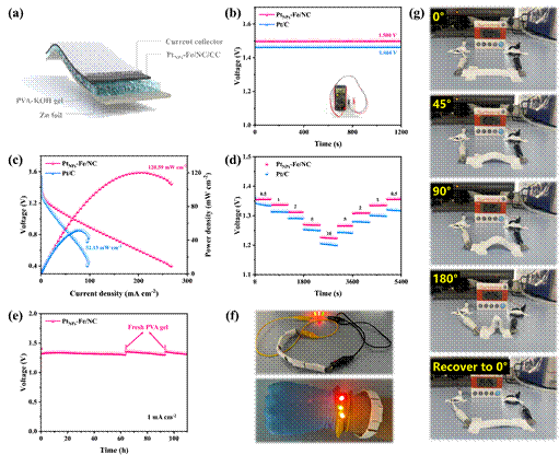 图5. 柔性固态ZABs性能测试。