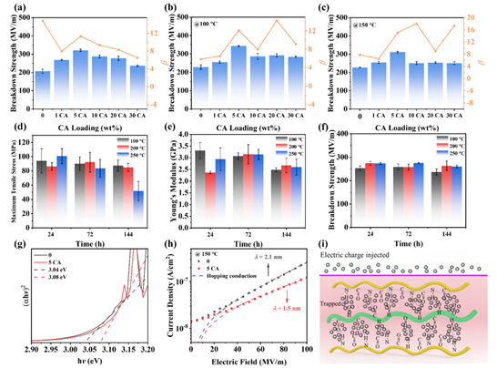 图8. 全有机芳纶薄膜的环境耐受性分析。(a)在100 ºC绝缘硅油中处理24 h的全有机芳纶膜的击穿强度分析;100 ºC(b)和 150 ºC(c)下薄膜的击穿强度分析;不同温度处理后5 CA薄膜的强度(d)和杨氏模量(e);(f)不同温度处理后5 CA薄膜的击穿性能分析;(g)薄膜的带隙;(h)150 ºC下薄膜的泄漏电流分析;(i)高温下薄膜的内部电荷传输机制。