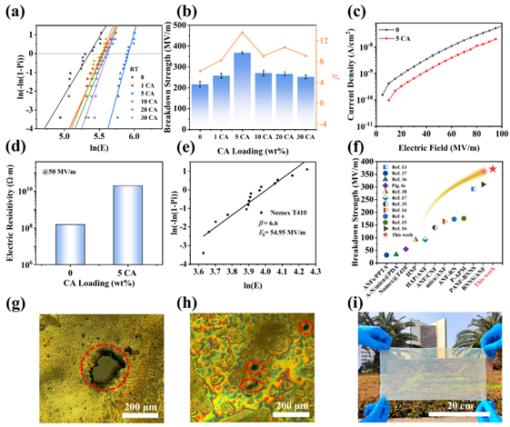 图6. 不同CA含量的击穿强度分析。(a)威布尔曲线分布;(b)击穿强度分析;(c)薄膜泄漏电流试验;(d)薄膜电阻率;(e)商业Nomex®T410绝缘膜的击穿强度分布;(f)文献报道的芳纶膜与全有机芳纶膜的击穿强度比较;(g-h)薄膜表面的光学显微照片;(i)5 CA薄膜的照片。