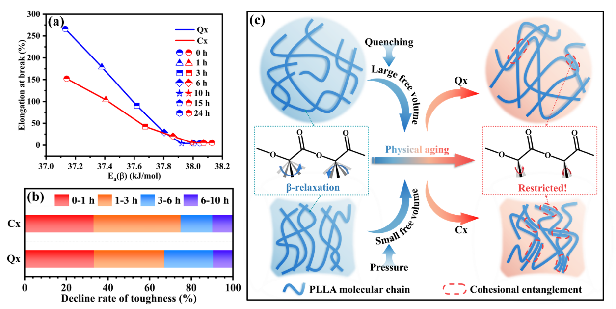 图6. (a)不同老化时间下淬火和冷压样品的断裂伸长率与β弛豫活化能的变化情况;(b)淬火和冷压试样在不同老化时间段内延展性下降程度的比较;(c)物理老化过程中PLLA凝聚缠结的形成及其对松弛行为的影响示意图。