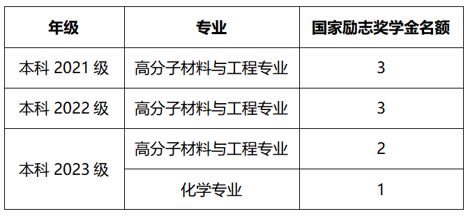 国家励志奖学金9名:原则上各年级学生获奖名额分配如下,最终按照学院学生奖励评审小组综合评审成绩,择优推荐人选: