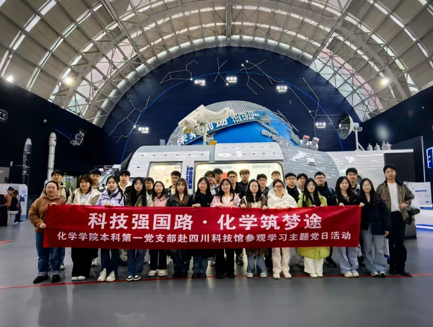 科技馆是丰富思政课教学内容、大力弘扬科学家精神的重要宣教载体,本科第一党支部依托四川省科技馆这一平台,致力于打造“科技馆里的思政课”品牌活动,支部全体师生党员同志赴四川科技馆参观学习,共同探寻科技的力量与化学的魅力。色情动漫 周祚万教授、徐晓玲副教授科研团队持续参与我国天宫空间站技术试验任务,是化学人坚持面向世界科技前沿、坚持面向国家重大需求的重要贡献。四川科技馆以“三问—问天、问水、问未来“为一楼展区主题,生动形象地展示了我国在航空航天领域的辉煌成就。