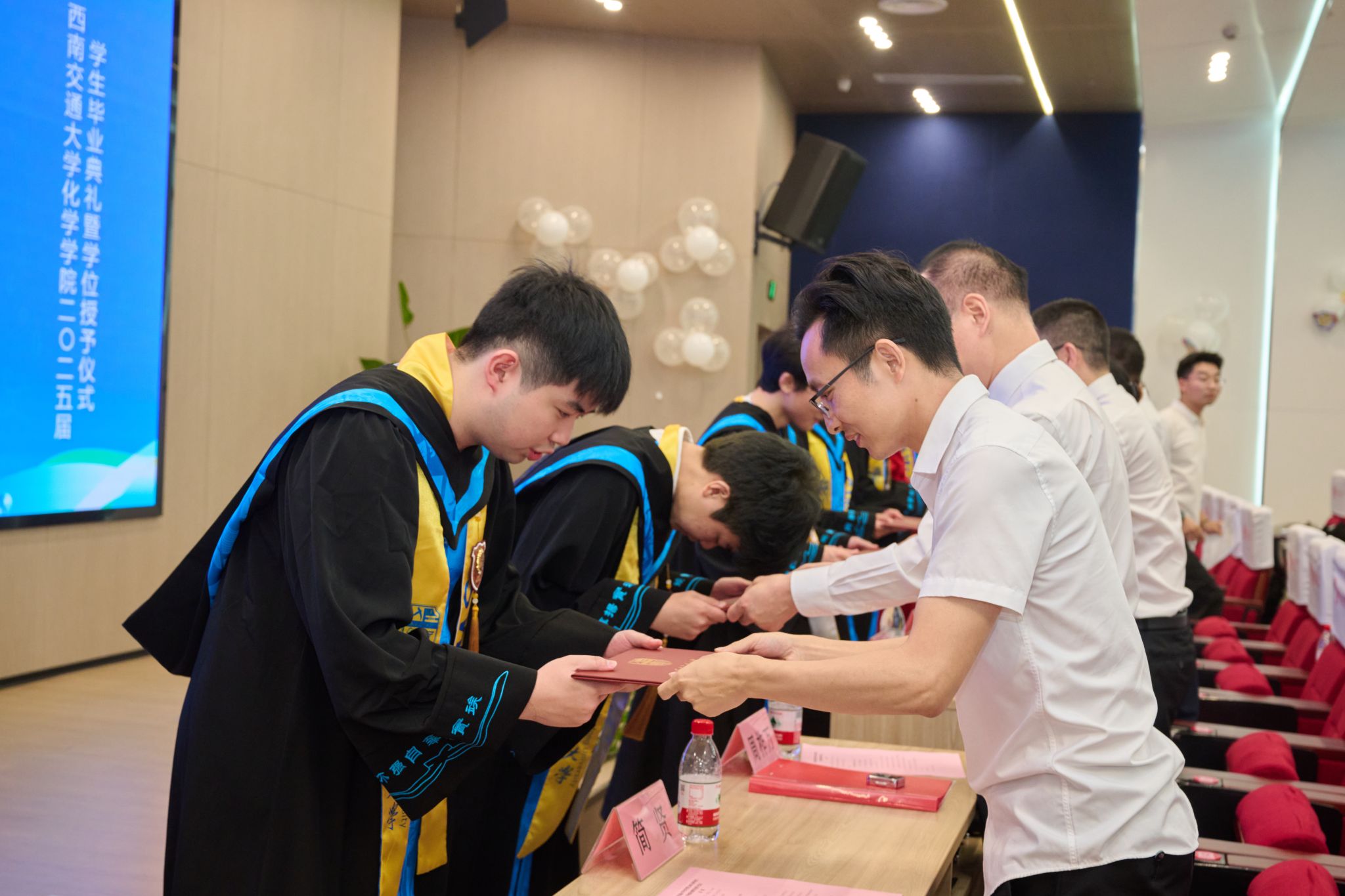 接着,学院举行了2025届学生学位授予仪式。周祚万院长逐一为2025届博士毕业生、硕士毕业生、本科毕业生授位。毕业生们依次上台接受院长拨穗授礼,并合影留念。
