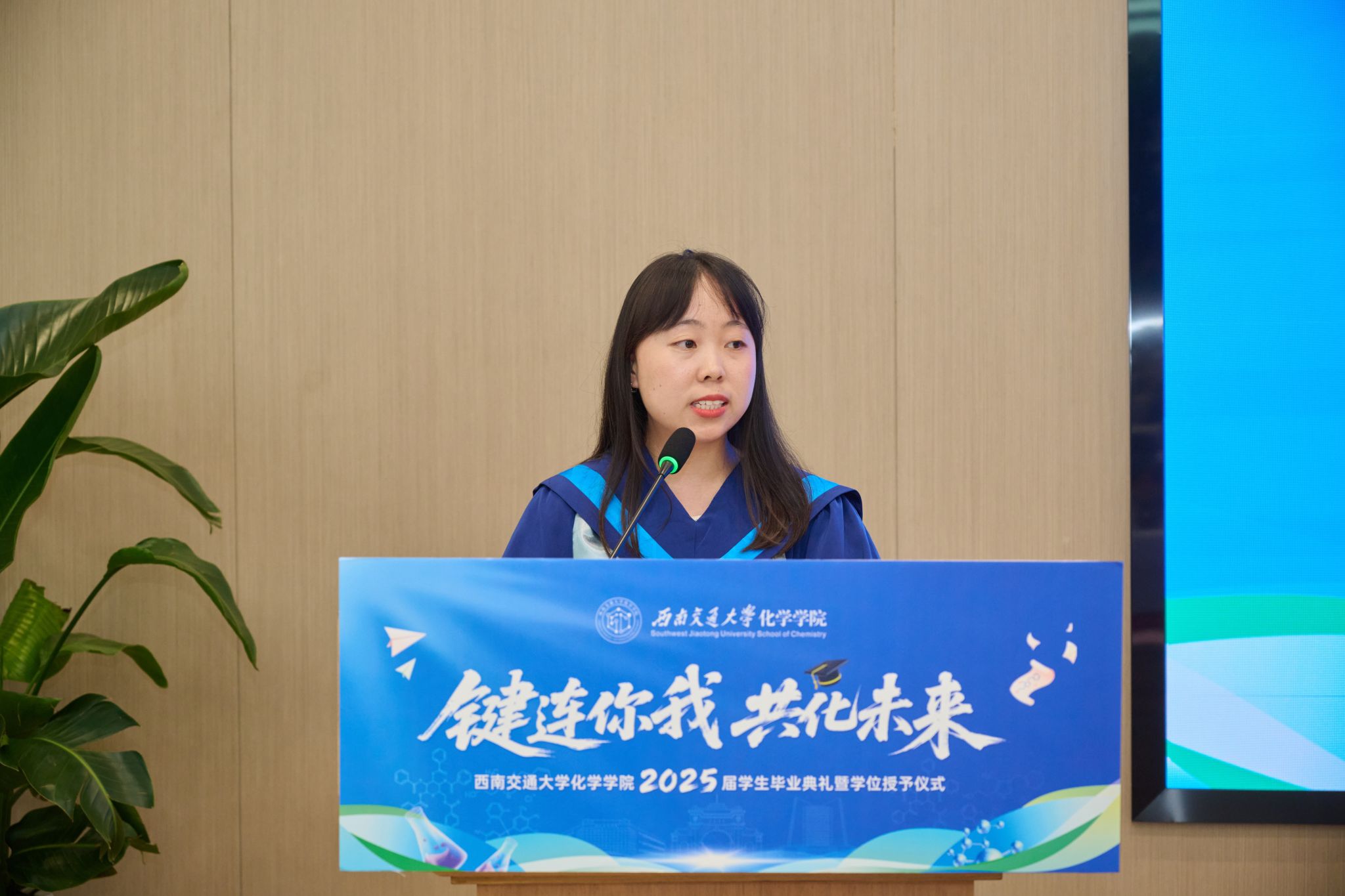 此次典礼还特别邀请了校友代表、电子科技大学材料与能源学院教授、博士生导师简贤发言。简贤校友于2003年至2013年(本硕博)就读于高分子材料与工程方向,他分享了自己的求学经历和职业发展历程,鼓励毕业生们要珍惜时光,不断进取,为国家和社会的繁荣发展贡献自己的力量。他的发言赢得了现场师生的热烈掌声。